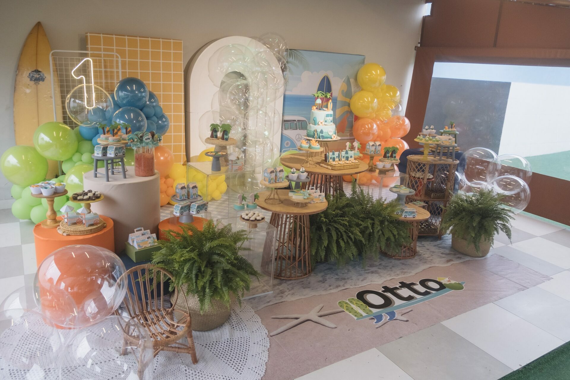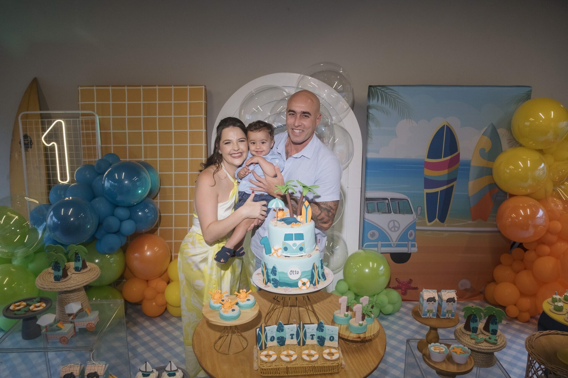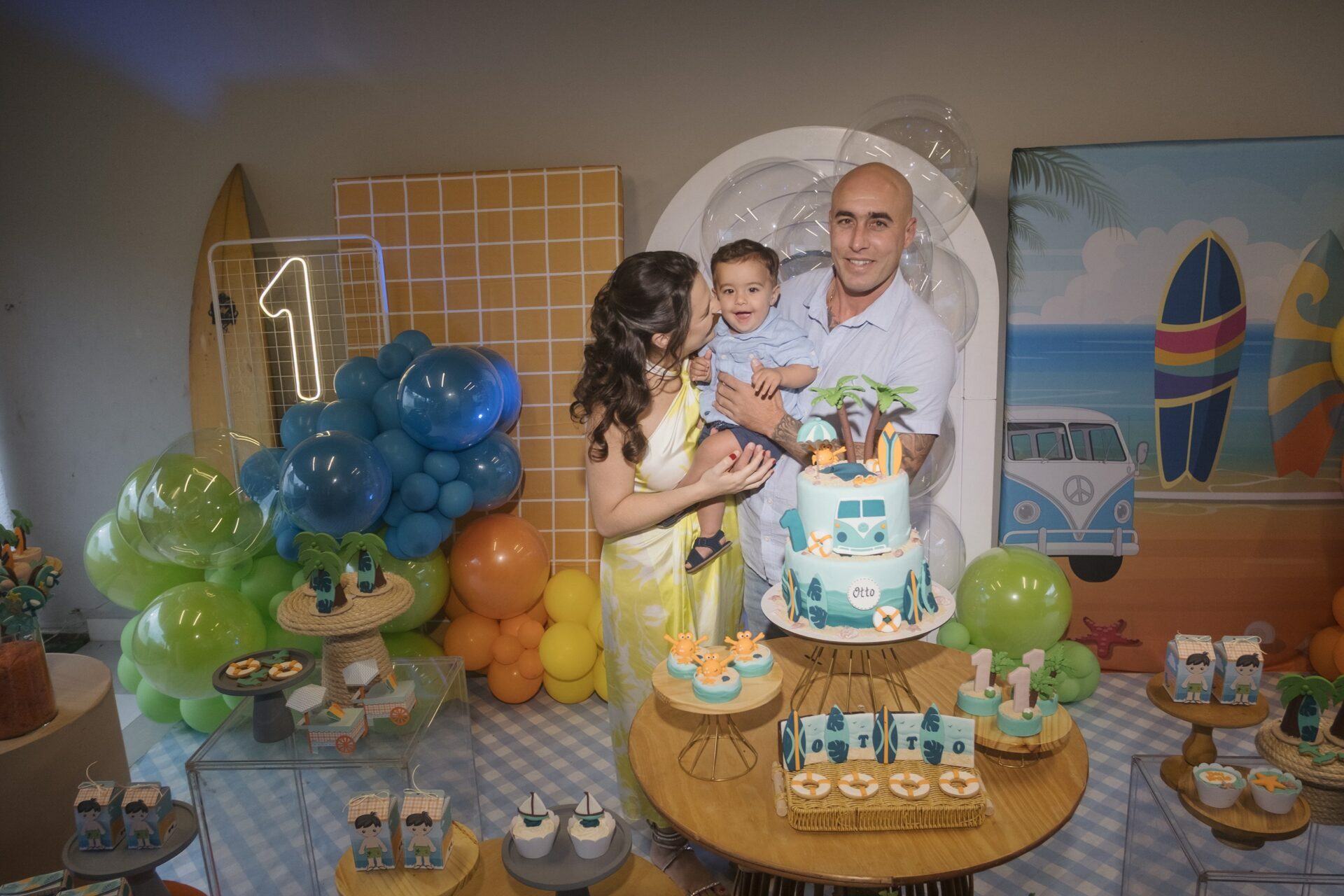 Cada detalhe da decoração trouxe a sensação de um dia divertido na praia: muitas cores vibrantes, pranchas de surfe, uma kombi retrô e docinhos personalizados que encantaram a todos.