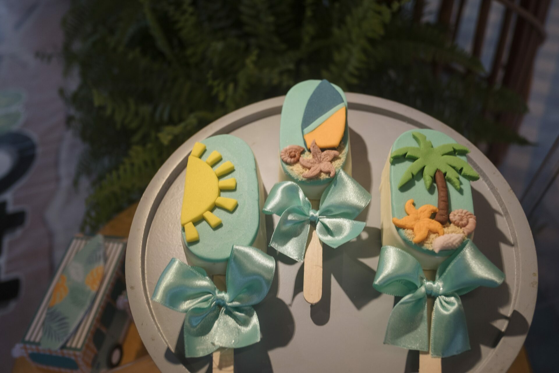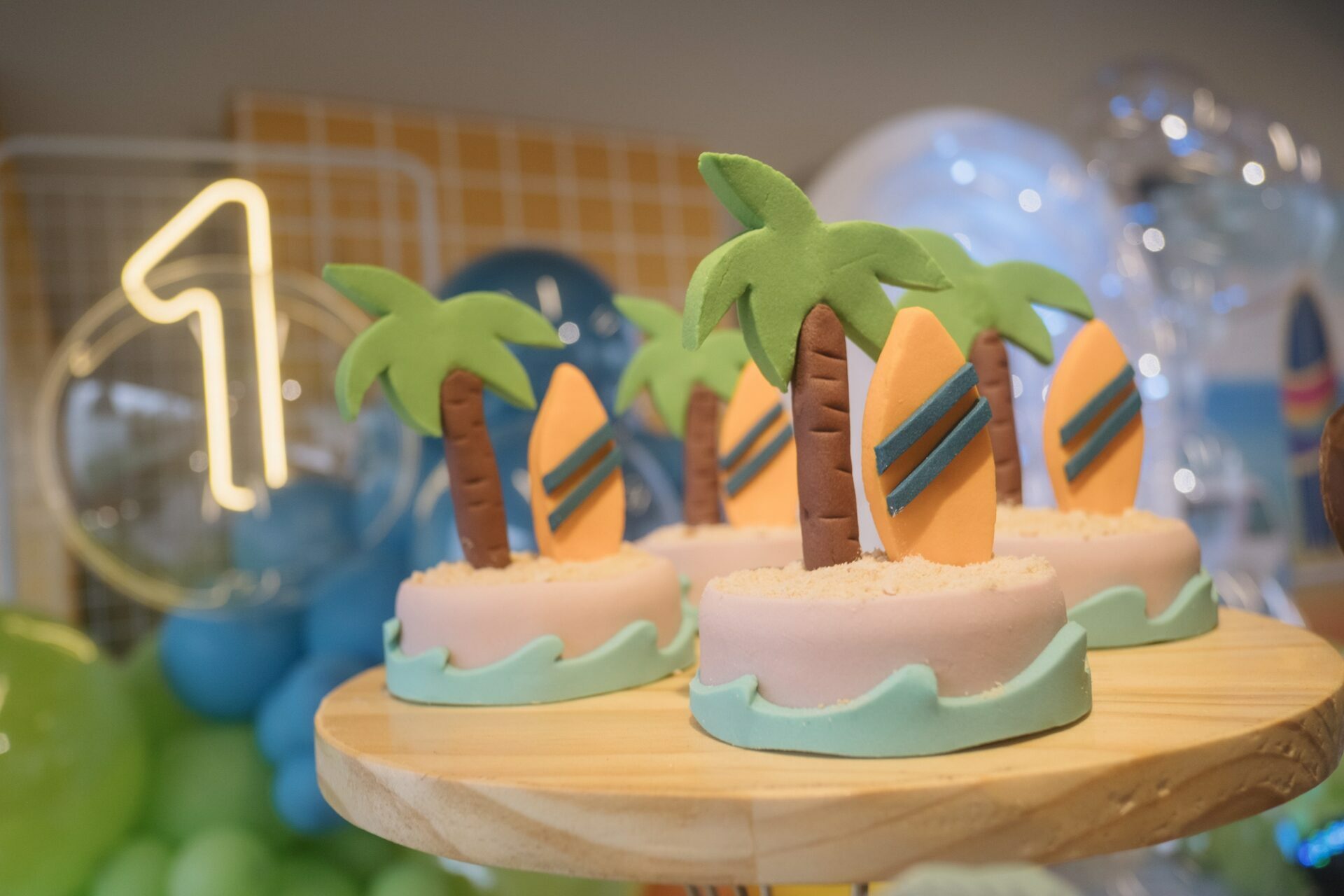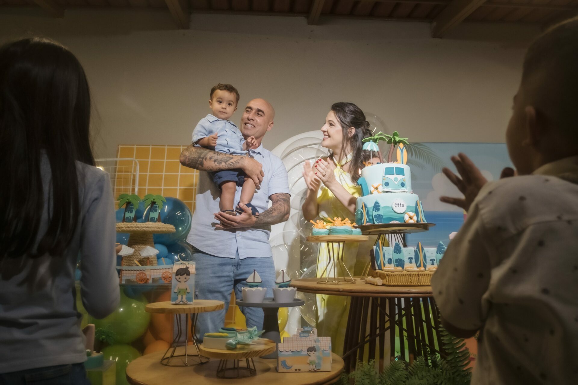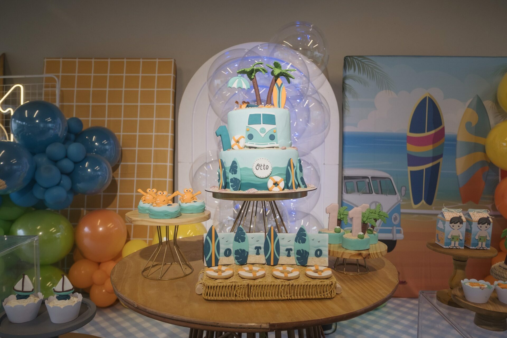 Cada detalhe da decoração trouxe a sensação de um dia divertido na praia: muitas cores vibrantes, pranchas de surfe, uma kombi retrô e docinhos personalizados que encantaram a todos.